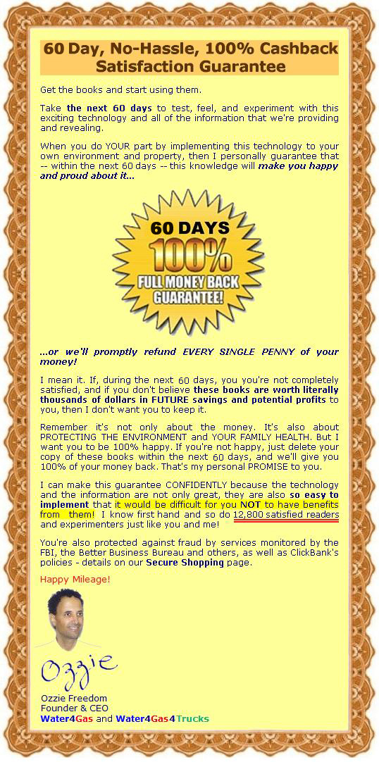 IMPORTANT NOTE: We don't have the funds to prove the validity of each plan. We have NOT written them. Yet we feel that it is important to keep suppressed technologies alive, so even if you don't find the time, space or skills to build one of these water cars yourself, please get them free with your order and give/sell them to everybody who may be interested. Thanks! ~Ozzie Freedom