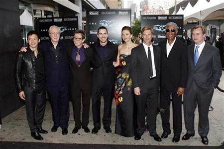 Actors (L-R) Chin Han, Michael Caine, Gary Oldman, Christian Bale, Maggie Gyllenhaal, Aaron Eckhart, Morgan Freeman, and director Christopher Nolan pose for photographers for the premiere of the film The Dark Knight in New York, July 14, 2008
