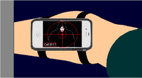 A prototype of a system that will become available in early 2016 features a pair of “Smart-Glasses” that displays GunPro’s live video stream in one of its lenses - effecting what’s called a “heads-up display” configuration.  It immediately became obvious to us that keeping one’s head up and trained on their surrounding area instead of angled downward and focused on their forearm - can improve overall situational awareness.  ( please reference image ‘1-C’ below )