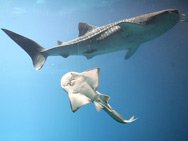 Ralph, a whale shark, swims above a ray at the Georgia Aquarium in Atlanta